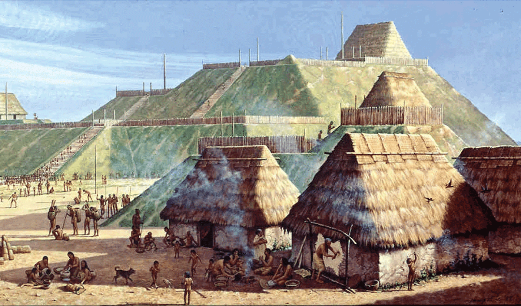 Me përhapjen e kultivimit të misrit, fshatrat filluan të shfaqen në luginat pjellore të pjesëve juglindore dhe mesperëndimore të Amerikës. Kjo ndodhi afërsisht 1200 vjet më parë. Më i madhi nga këto fshatra ishte Cacocia, me një popullsi prej rreth 20,000 banorësh. I rrethuar nga një gardh i lartë prej druri, qyteti përmbante të paktën 120 kodra dheu të ndërtuara me 14 milionë shporta me dhe.