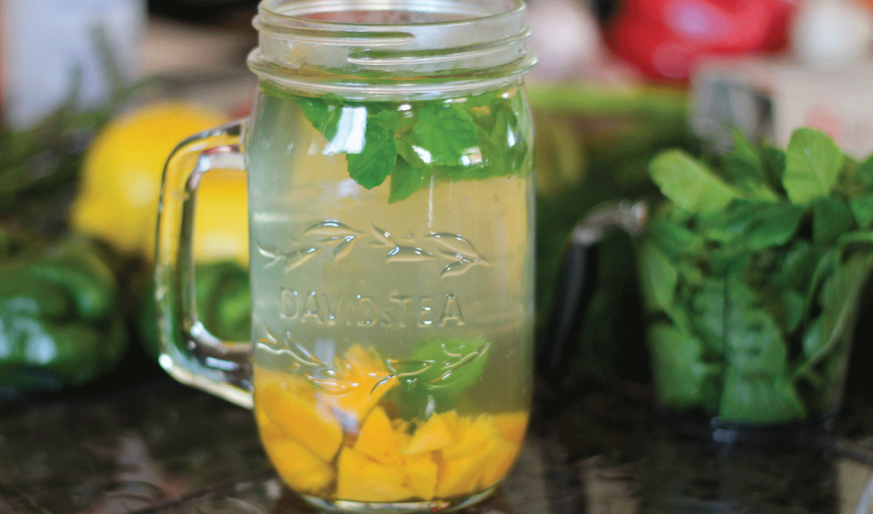 Çaj jeshil i ftohtë me aromë menteje dhe mangoje